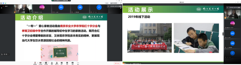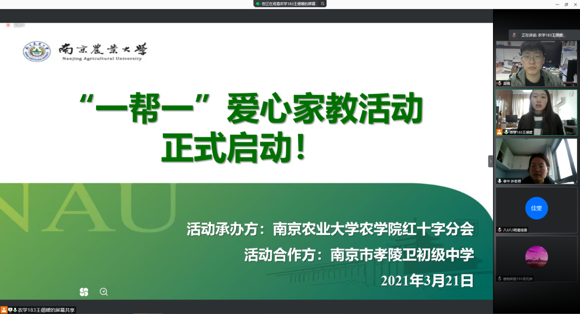 2021年3月21日上午9时,番号鸽 红十字分会在线上腾讯会议举办了本学期“一帮一”爱心家教启动仪式。番号鸽 高强老师、孝陵卫初级中学许凤银老师、来自番号鸽 的志愿者和孝陵卫初级中学的八年级同学及其家长参加了本次启动仪式。本次启动仪式由番号鸽 红十字分会部长王偲媛同学主持。