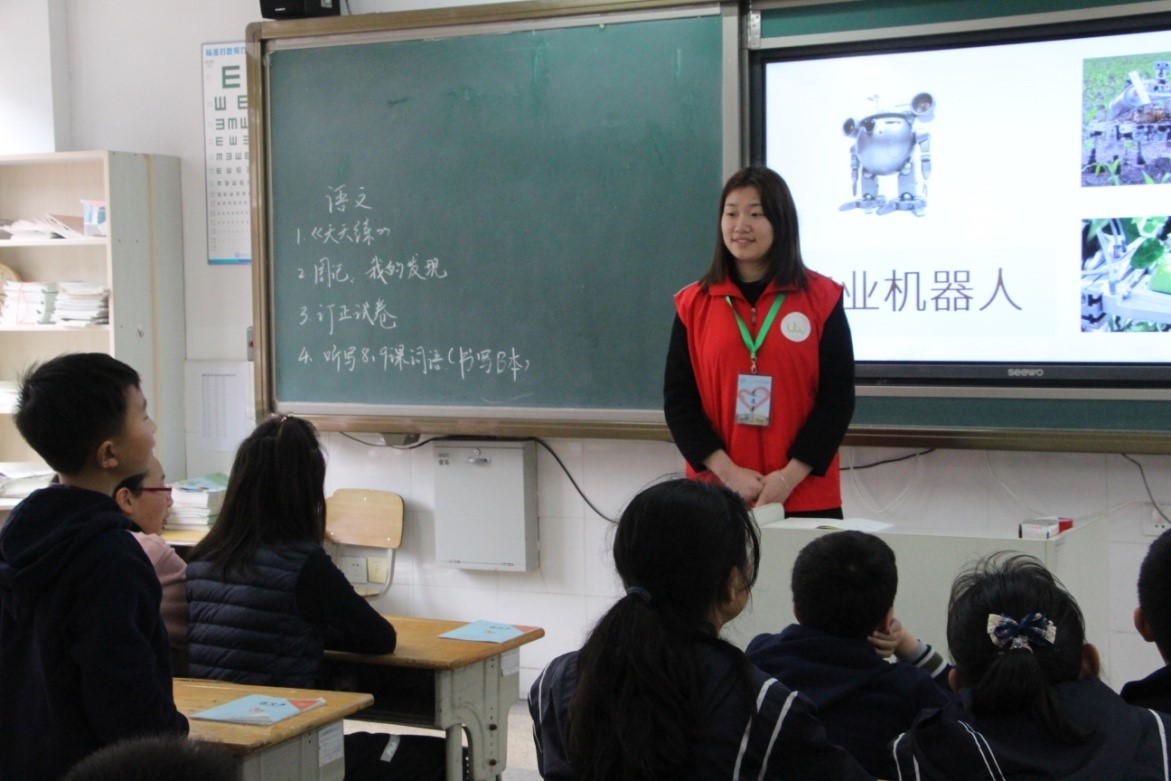课堂上,志愿者乔志豪、李钦瑶结合PPT从主要农作物、现代农业技术、植物分类三个方面讲解了植物分类知识和农业常识。其他几名志愿者坐在孩子们中间,为他们答疑解惑。