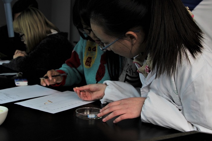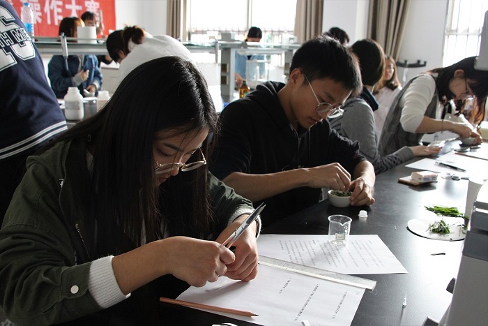 初赛分为实验和笔试两部分。45支队伍共分两场,分别于生科楼A1004、A1010进行实验操作。实验分为:A实验农作物种子识别、B实验纸层析法分离叶绿素。笔试于晚上七点在教学楼c301举行,历时一个半小时。参赛选手们配合默契,小声议论着实验结果的准确性,互相商讨并统一意见。