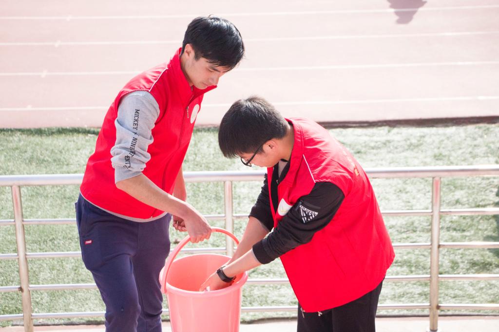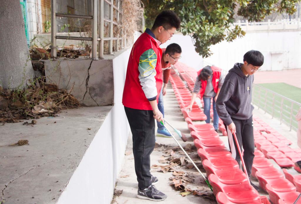志愿者们秉承“学雷锋,忆传统,献爱心”的精神,以帕子、扫帚、水桶为工具,擦拭座椅、拾起落叶纸屑、扫去尘土。清晨的和煦阳光散落下来,志愿者们辛勤的劳动成为了今日最佳的校园风景,并得到了老师和同学们的赞扬。两个小时后,主席台两侧以及靠近玉兰路一侧的共1930个观众席座,全部被清理干净,焕然一新。