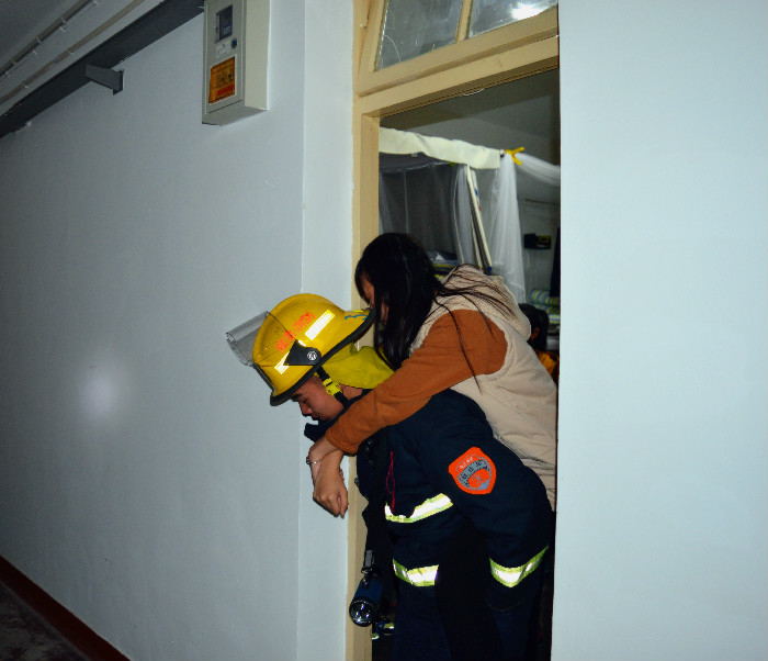 现场演示之后便是消防演习的阶段。演戏现场模拟火情,滚滚浓烟席卷了女生宿舍六楼,侦查员查明情况,立即拨打119报险,并拉响警报,消防士兵迅速反应,现场对火情进行控制。同学们在安全员的帮助下,迅速疏导,负责人现场计时。