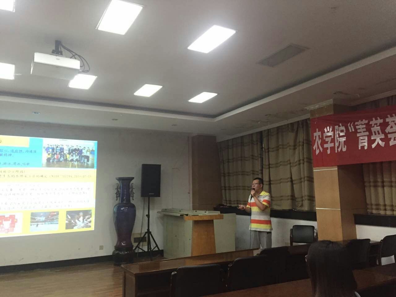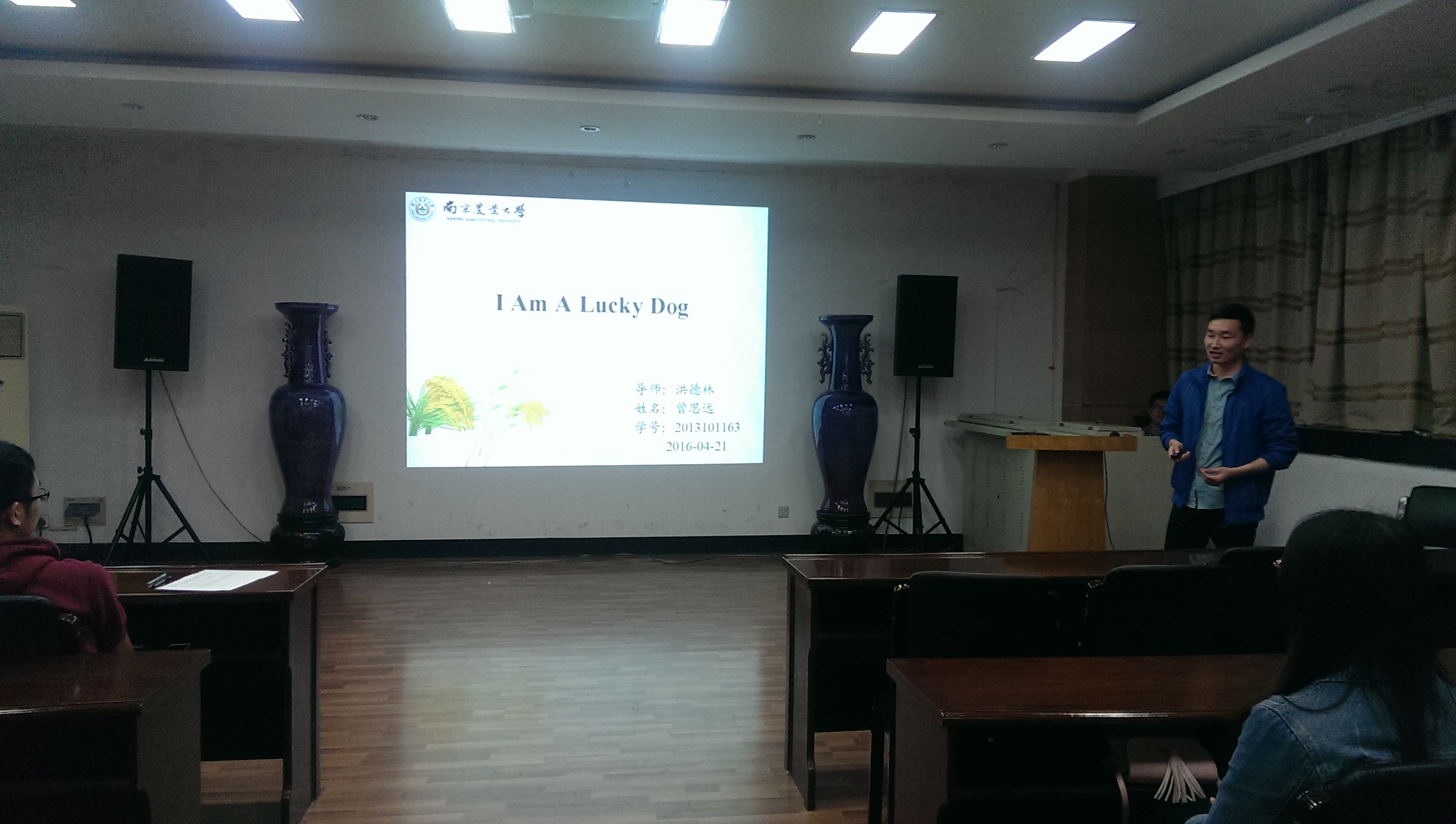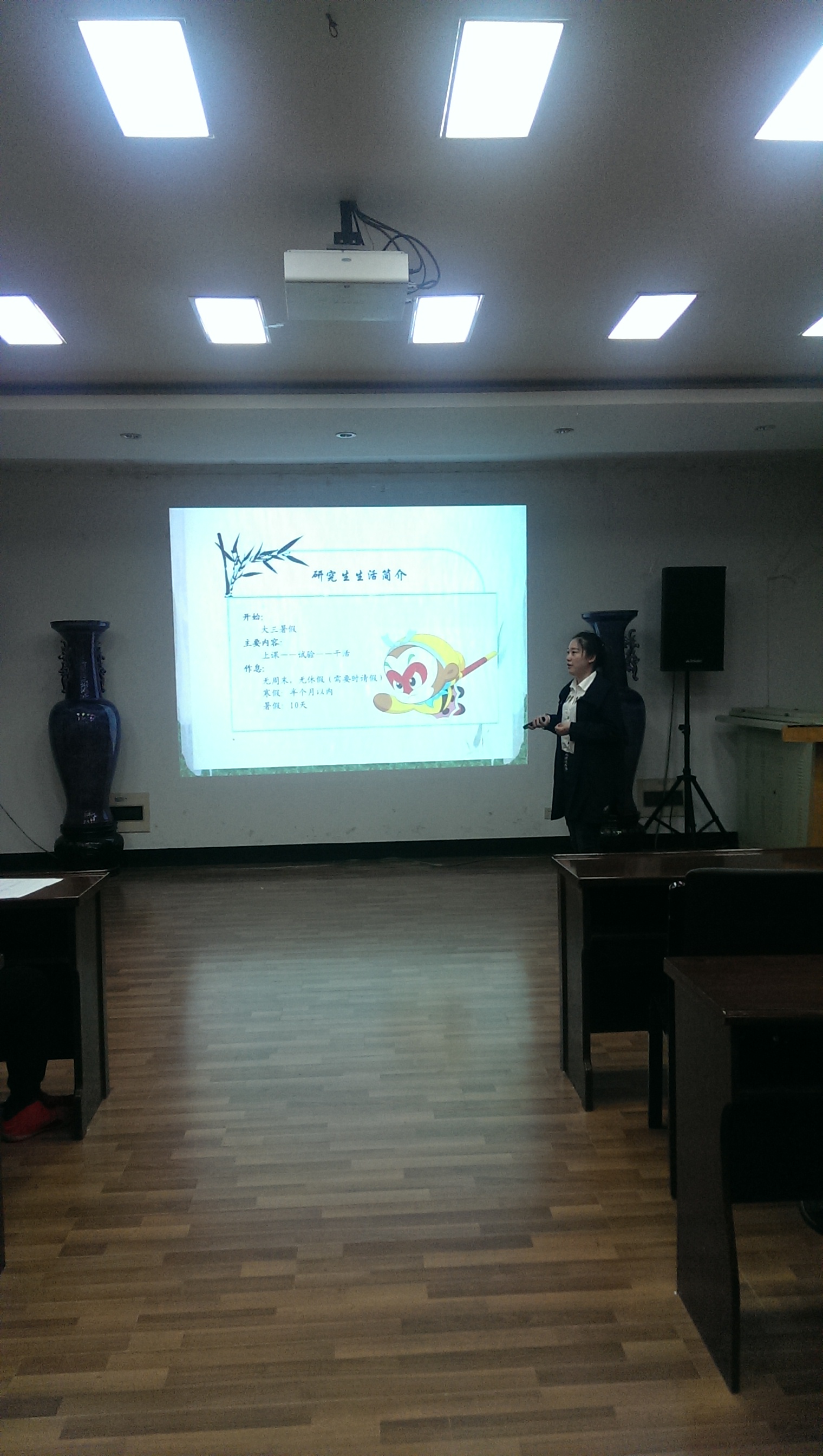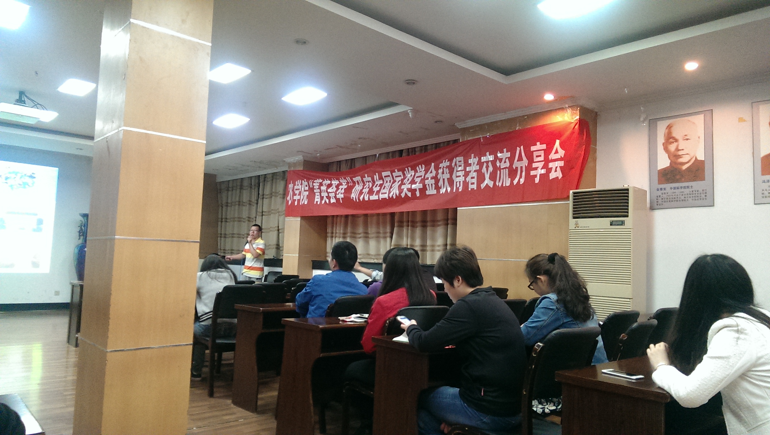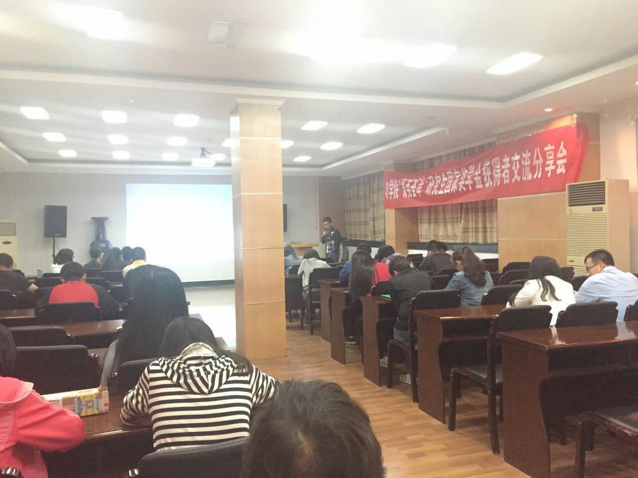 研究生会狄丽俊同学主持。首先,张贺同学对自己的生活、学习、 科研等方面精彩的介绍,建议大家多参加一些自己喜欢的活动,增加自己的阅历,多向老师和同学请教。随后,任锐同学着重讲了自己平时的学习心得。之后,陶宝瑞同学以幽默风趣的方式与在场同学分享自己的人生目标与科研态度,另外她认为在实验过程中难免会遇到问题,与导师及时的交流对问题的解决至关重要,同时也要与师兄师姐多沟通。曾思远同学从自己的角度为大家讲述了他的国奖之路。最后,孟庆玲同学认为平时做事应该要有计划性,这样才能更有效率的去完成它。4位同学以渊博的知识和风趣幽默的讲解,获得了同学们的一致好评。