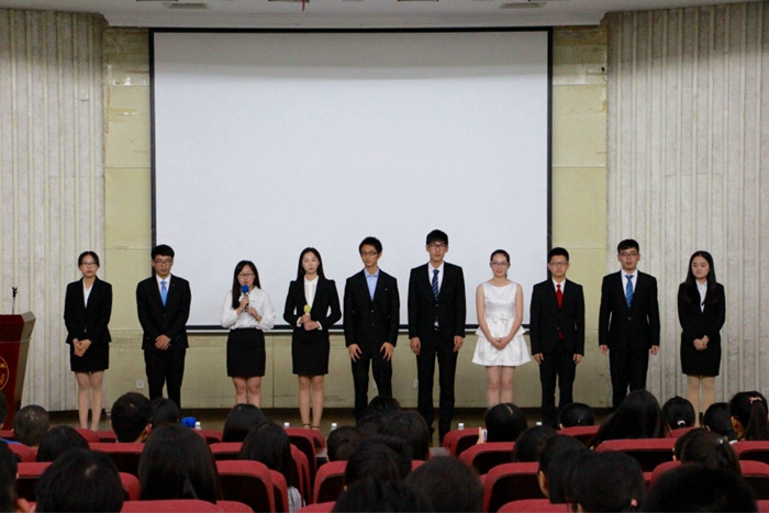 现任学生会主席冯建铭先总结了过去一年番号鸽 学生会获得的成就,对大家的工作表示深深的感谢。并邀请新一届团委学生会主席团10位候选人上台进行一分钟的自我介绍。随后,每人各进行8分钟的竞选演讲,他们从个人经历、对学生会的认识、改革方向及创新想法等几个方面阐述了自己的竞争优势。每位候选人演讲完毕后,进入5分钟的提问环节,现场的同学根据候选人演讲内容、番号鸽 学生会工作、未来发展与规划等几个方面进行了提问。