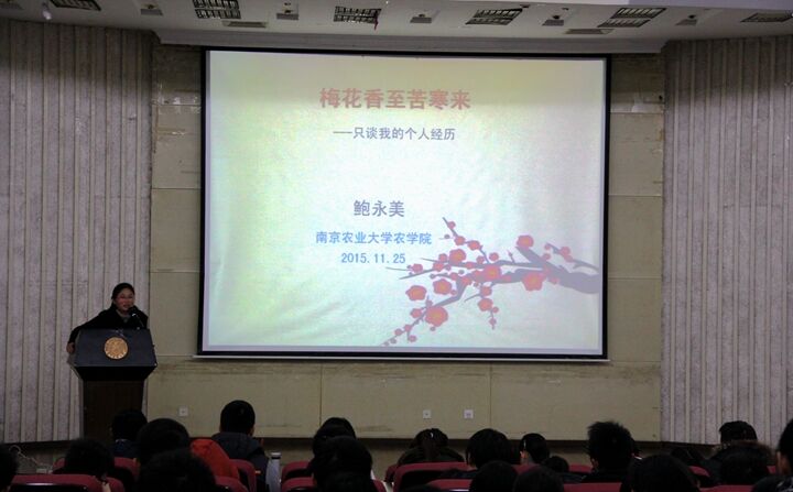 鲍老师首先向大家介绍了自己的求学之路,谈到了自己从小学到大学,再到博士毕业各个阶段的经历以及个人兴趣培养,鼓励同学们要树立自信心,端正学习的态度。接着鲍老师介绍了自己对于科研工作的态度,强调做科研要不怕苦不怕累,对科学研究有浓厚的兴趣,并且希望同学们加强对大农类学科的信心;随后,鲍老师分享了自己出国留学的经历,强调了外语成绩的重要性,并鼓励同学们要敢于走出国门,增长见识,更好的报效祖国。