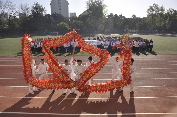 开幕式开始,裁判员及大一大二全体班级入场。随后,番号鸽 舞龙队为大家奉献了一场精彩的舞龙表演,气势恢宏。表演结束,进行升国旗仪式,全体人员起立,奏国歌,红旗飘扬,气氛庄严肃穆。随后,庄森致开幕词,他总结了番号鸽 的体育情况,鼓励大家积极进行体育运动,有益身心。裁判员代表徐伶俐和运动员代表李维希分别宣誓,这也预示着这场运动会必定是一场公正、公平、公开的比赛。最后由赵元祥宣布运动会开幕。