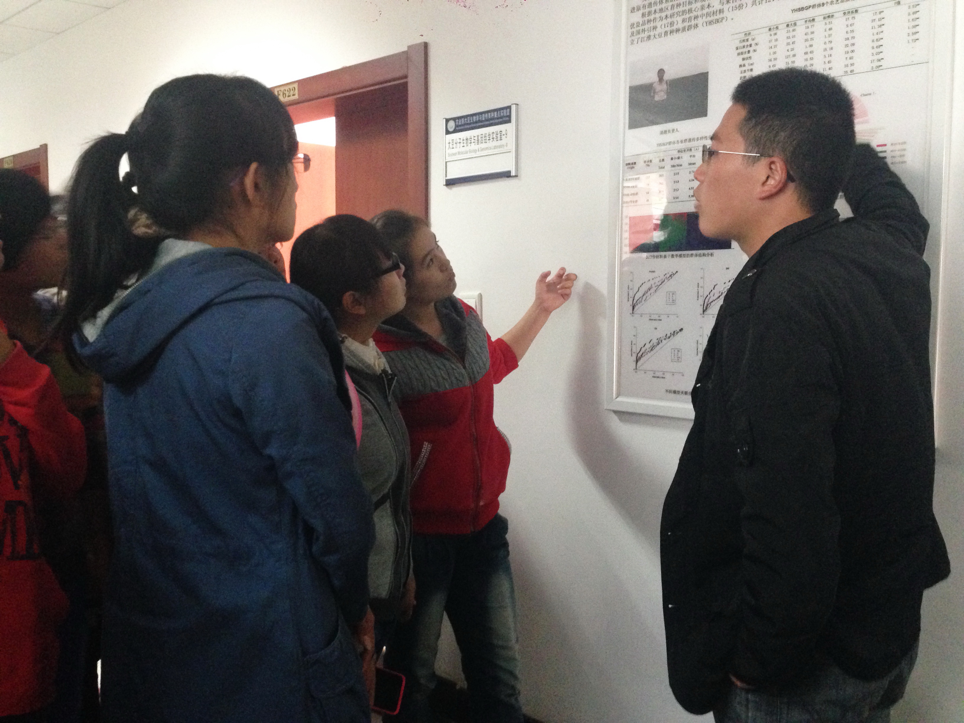 在作物遗传与种质创新国家重点实验室,讲解老师刘老师开始便对大家做了很大鼓励,鼓励年轻人搞科研搞创新。他先介绍了研究组人员的组成,并重点提到了中国工程院的两位院士盖钧镒教授及刘大钧教授以及其他重要组成人员,简述了课题组所获得的各项成果,并带领同学们参观了各类实验仪器。大家的兴趣都很高昂,好奇的看着这些陌生的仪器装置,不断有新的问题提出来,老师都一一给予了解答,气氛很活跃。在国家大豆改良中心,这里的讲解员不仅带领大家参观了仪器,还让同学们进入了实验室,为大家演示了部分仪器的操作方法,同学们认真观看,频频提问。
