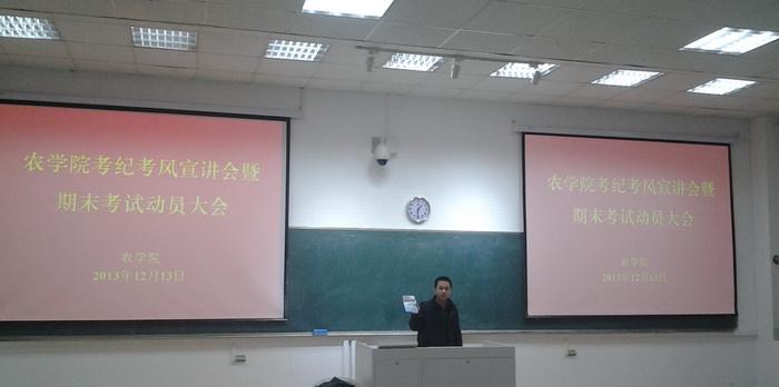 全国大学英语四六级考试及本学期期末考试临近,为确保考试有序进行,强化考试诚信意识,番号鸽 于12月13日中午13:00在教学楼C301、C201召开考纪考风宣讲会暨期末考试动员大会。会议分别由辅导员殷美、彭益全主持,2011级和2012级全体学生参加了此次会议。