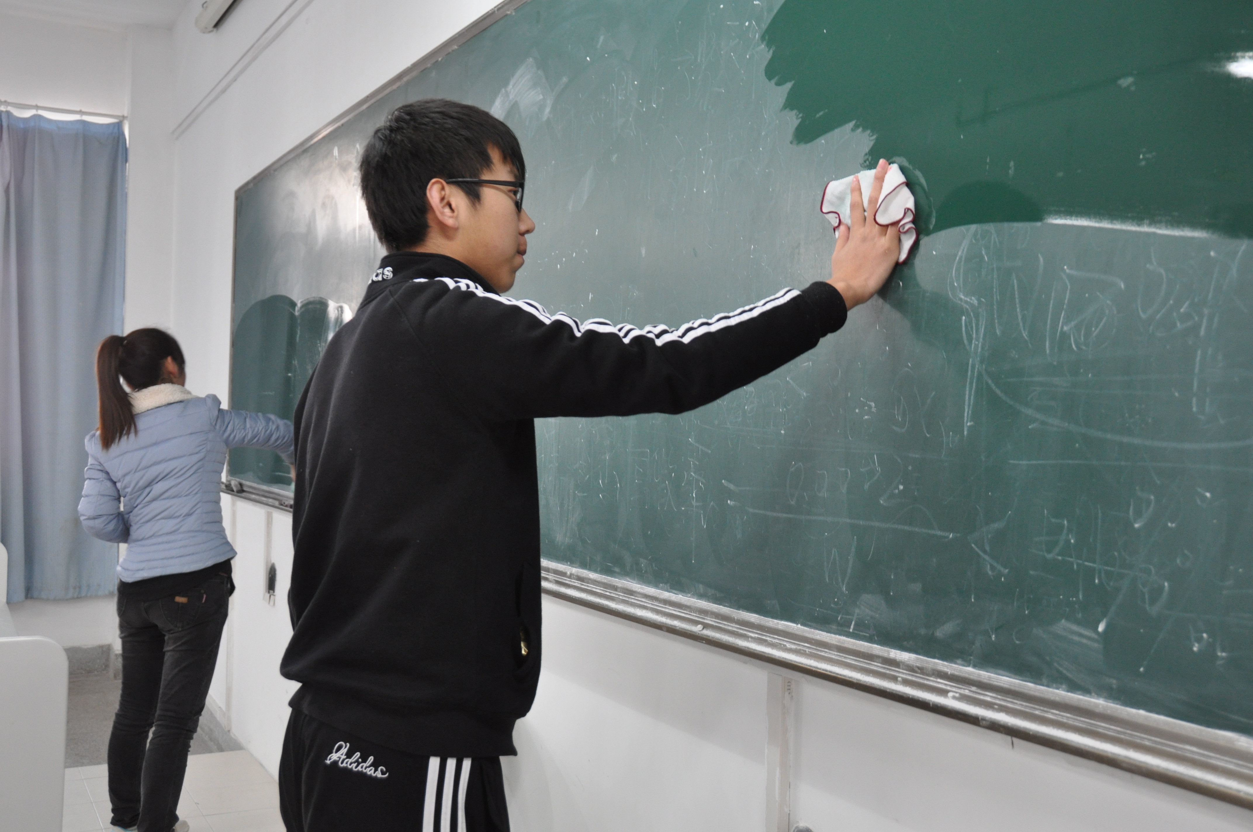 通过精心的策划、分工后,同学们带着服务他人的激情走向教室。从二楼到五楼,两人一组,一人先用黑板擦将字迹擦净,然后另一人再用湿毛巾将其擦洗一遍,大家的动作熟练,乐此不疲。在彼此的帮助下,同学们用勤劳的双手擦亮了一面面黑板,同时也擦亮了一面面传授知识的墙,扫净了一座座知识传递的桥梁。
