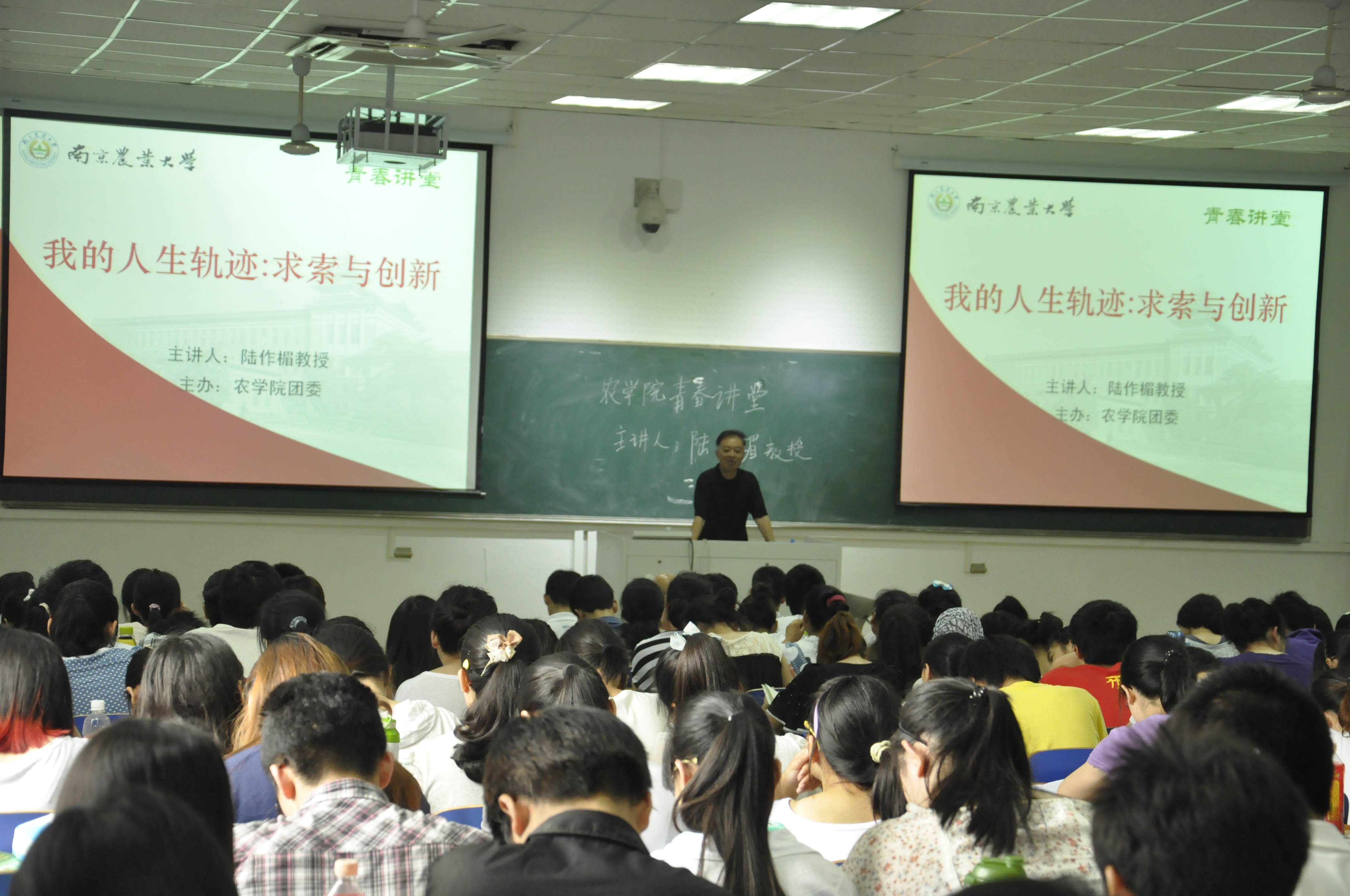 陆作楣从十年大学到十年苏北农村的基层工作经历再到番号鸽 任教三十年的坎坷科研路展开演讲。在大学期间,他以读书为乐,自强不息,刻苦学习,严谨踏实努力掌握专业知识。他用“深入浅出,雅俗共赏”表达了自己对科研论文写作的认识,同时也举了很多的例子表达了对科研工作的热爱和执著,艰苦的科研路上,他不断创新求索,不断攻坚克难,在“三系七圃法”、“棉花自交混繁法”、“稻麦大豆等株系循环法”、“玉米自交系内外交叉法”等一系列繁育技术中做出了杰出的贡献。演讲结束后,同学们围绕求索与创新意识的激发,大胆提问,畅所欲言。从对陆老师人生定位到水稻科研前景等多方面提问,活跃的现场气氛给同学们留下了深刻的印象。当有同学问到大学毕业后他的定位时,陆作楣说:“人要有想法,有自己的目标,我的想法就是投身于最需要我的地方”。陆教授强调了基础知识学习和实践参与的重要性,并告诫同学们,学习是一个逐渐积累的过程,希望广大学生能认真对待学业,踏实学习,未来造福于社会、服务于国家。