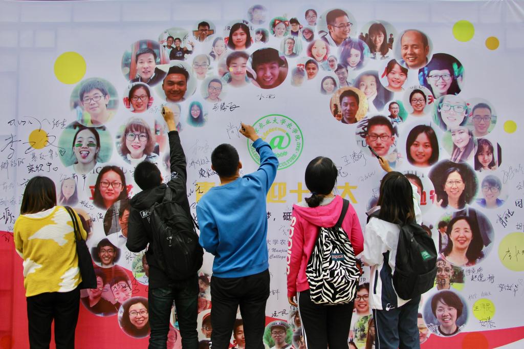 “青春喜迎党的十九大”是由一百来张同学、老师笑脸照组成的巨大签名墙,颇为壮观震撼,签名仪式现场热烈。作为一名中国青年大学生,作为一名诚朴勤仁的南农人,我们有义务积极学习党的十九大精神,准确把握我国发展的新的历史方位,以习近平新时代中国特色社会主义思想、马克思列宁主义、毛泽东思想、邓小平理论、“三个代表”重要思想、科学发展观为党的行动指南。这也是我们举办签名仪式的初衷,我们不仅弘扬党的指导精神,还得要行动起来,从身边做起。