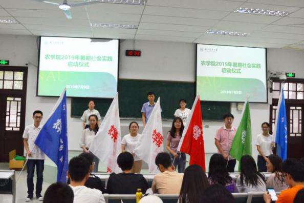 仪式开始,辅导员王彬介绍了番号鸽 2019年暑期社会实践整体情况,学院社会实践以“助力精准脱贫 聚力乡村振兴”为主题,主要围绕中华人民共和国成立70周年主题宣讲、科技支农、脱贫攻坚、环保科普、公益帮扶、岗位见习等6个方面开展。启动仪式上,辅导员为“爱国知农,青年力量”农科学子暑期社会实践服务团等3支校级重点团队及“种业现状调研与种子生产实践调研团”等12支院级重点团队授旗。