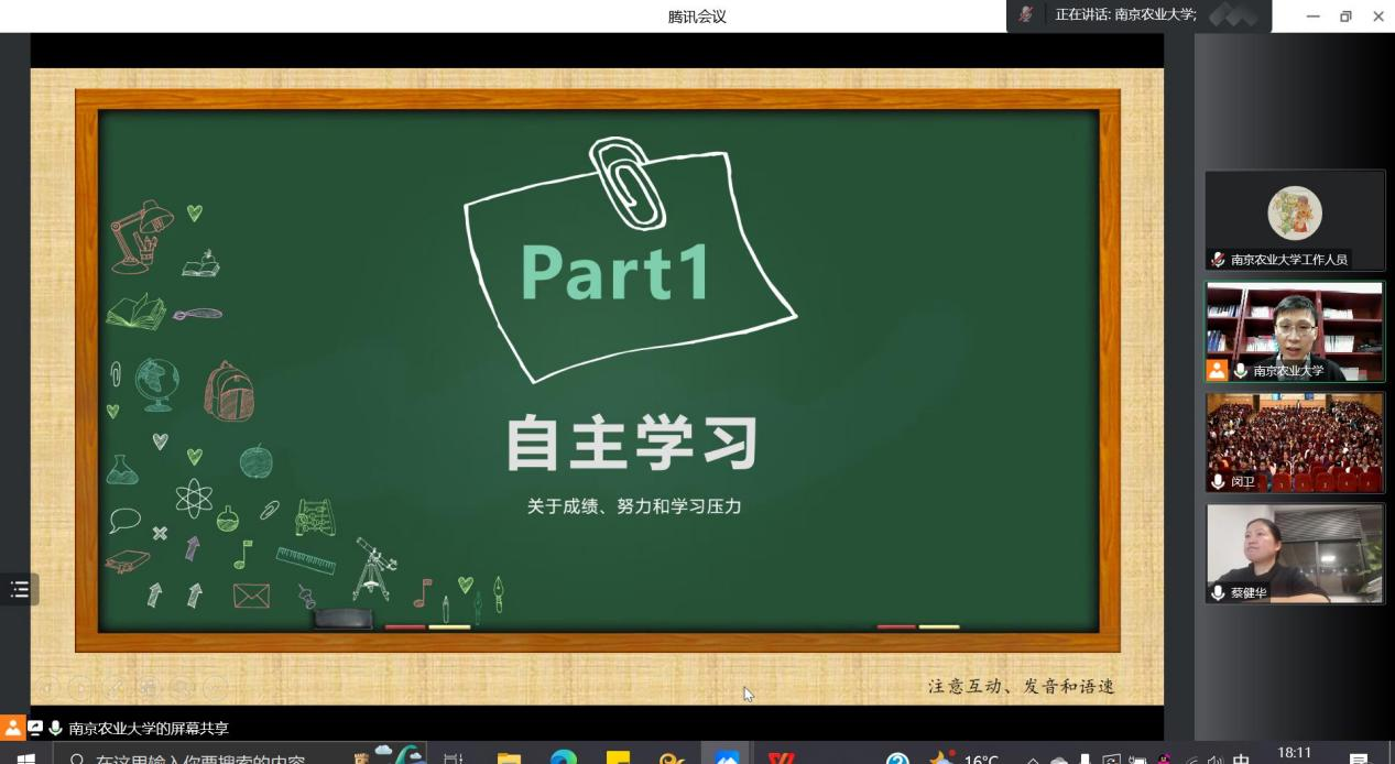 本科生辅导员孙小雯、海门中学高二全体学生集中线上观看学习,会议由海门中学文化办主任蔡健主持。